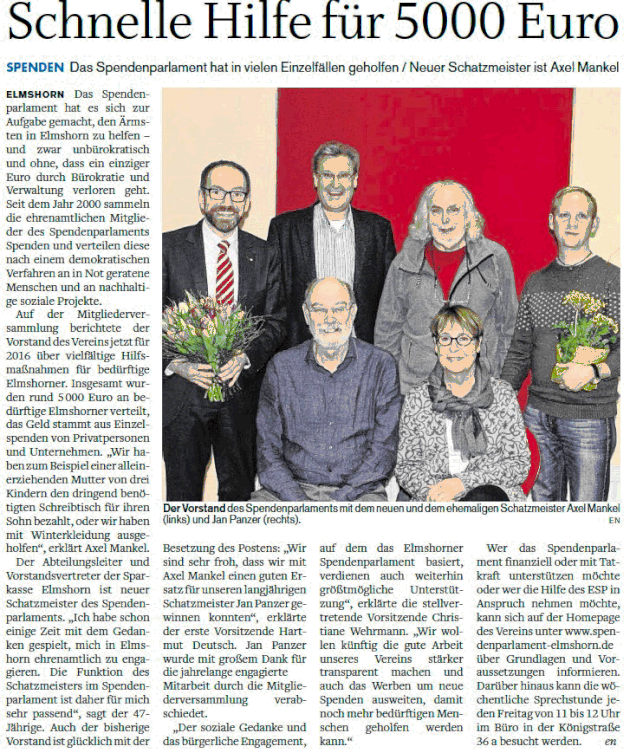 Die Beteiligung des ESP am 8. Selbsthilfetag am Samstag, den 29. April 2017 im Regioklinikum Elmshorn war eine gute Möglichkeit mit Betroffenen aber auch mit Multiplikatoren ins Gespräch zu kommen. Am Infostand konnten Axel Mankel (Schatzmeister) und Christiane Wehrmann (2. Vorsitzende) über ihre Aktivitäten im Elmshorner Spendenparlament berichten und für ihre Institution werben.
